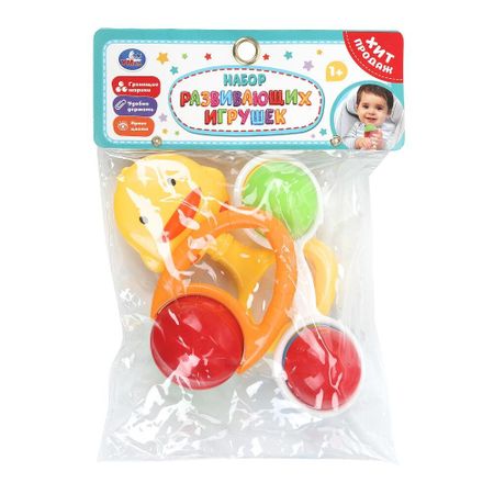 Погремушка Умка 1801M303-R1. Набор развивающих игрушек ТМ «УМка» разработаны специально для малышей:<br> — яркие цвета и интересные формы<br> — гремящие шарики<br> — удобно держать<br> — 3 игрушки в комплекте<br> <br> Игрушки выполнены из окрашенного в красочные цвета, прочного и гипоаллергенного материала. Симпатичный дизайн, «хватательные» рельефные элементы и гремящие шарики привлекут внимание ребенка, который с удовольствием будет играть с такими милыми игрушками.<br> <br> Игра с погремушками ТМ «УМка» развивает:<br> — зрительное восприятие<br> — тактильные ощущения<br> — мелкую моторику рук<br> — координацию движений<br> — внимание<br> — цветовосприятие<br> <br> Размер: уточка — 13,5 см, овал с шариками — 11 см, гантелька — 14 см. Материал: пластмасса.<br> Рекомендовано детям от 1-го года.