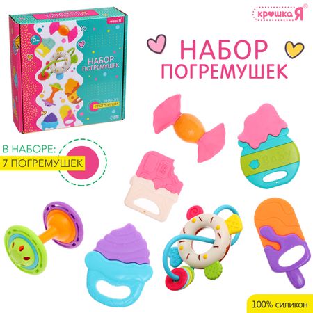 Погремушки детские «Сладости», набор 7 шт.. Яркий и развивающий набор из 7 погремушек в виде сладостей станет отличным спутником для малыша с первых дней жизни. Каждая погремушка выполнена из безопасных материалов и имеет приятную текстуру. <b> Особенности</b> <ul> <li> Каждая погремушка отличается по форме, размеру и текстуре. Это позволяет малышу изучать различные ощущения.</li> <li> Насыщенные цвета привлекают внимание ребенка и способствуют развитию зрительного восприятия.</li> <li> При встряхивании погремушки издают веселые звуки, которые радуют малыша.</li> <li> Игрушки изготовлены из качественных и безопасных для детей материалов.</li> <li> Погремушки легко удерживаются в маленьких ручках.</li> </ul> <b> Развлечение и обучение</b> Игра с погремушками — это не только весело, но и полезно для развития малыша. Разнообразные формы, текстуры и звуки стимулируют сенсорное восприятие, мелкую моторику и координацию движений. Яркие цвета привлекают внимание и способствуют развитию зрительного восприятия.