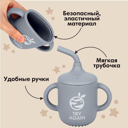 Поильник детский M&B «Try again» с трубочкой, силиконовый, от 5 мес., 200 мл., с ручками, цвет серый. Поильник детский с трубочкой выполнен из качественного 100% пищевого силикона. Пищевой силикон — это безопасный экологичный материал. Благодаря трубочке ничего не прольется, и одежда малыша останется сухой и чистой. Кружка- поильник рекомендуется детям от 6 месяцев. Бутылка имеет 2 удобные закругленные ручки. Внутри кружки есть метка для определения максимального колличества жидкости .Даже самый маленький малыш сможет самостоятельно взять непроливайку в руки. Поильник детский состоит из кружки, съемной крышки и трубочки. Можно использовать в посудомоечной машине и СВЧ.