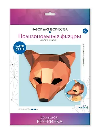 С набором по созданию полигональной фигуры «Хитрая лиса» каждый сможет собрать для себя стильную маску! Все детали вырезаны и пронумерованы, остается только продавить, согнуть, сложить и склеить все детали между собой. На каждой детали сделаны специальные засечки, которые позволят аккуратно согнуть детали и сложить их в идеальную объемную фигуру! Готовая маска используется в декоративных и развлекательных целях.