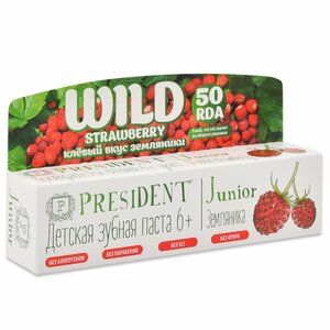 Детская зубная паста President junior “Wild Strawberry” 6+ со вкусом земляники (без фтора), 50 мл.Omnomnom, зубная паста с летним настроением для юных искателей приключений! Гелевая структура детской зубной пасты president junior “wild strawberry” 6+ со вкусом земляники обеспечивает безопасное и эффективное удаление зубного налета и уход за постоянными зубами от 6 до 12 лет.•Имеет контролируемую абразивность счищаемости — 50 RDA. Яркий рисунок летних ягод на тюбике подарит отличное настроение малышу и поможет сформировать полезную привычку!•Оригинальный вкус и аромат земляники превращает чистку зубов в удовольствие!