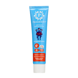 Детская зубная паста PRESIDENT® Ягодный микс 6+ обеспечивает заботу о деснах, укрепление эмали и эффективное очищение.Безопасно при проглатывании! Гелевая форма зубной пасты облегчает очищение в труднодоступных местах. Эффективность клинически доказана. Одобрено детскими стоматологами. 98% натуральный составБиодоступный кальций способствует интенсивной реминерализации, укрепляя эмаль молочных и постоянных зубовШалфей снижает риск воспаленияКсилитол подавляет рост бактерий и сокращает образование зубного налетаНЕ СОДЕРЖИТ: фторидов, агрессивных абразивов, , SLS, SLES, сахараБиодоступные растительные компонентыМеры предосторожности: Дети до 6 лет должны чистить зубы в присутствии взрослых количеством пасты размером с горошину. Не использовать при непереносимости компонентовКонтролируемая абразивность (RDA 50) обеспечивает деликатное очищение хрупкой эмали.RDA – это СТРОГИЙ КОНТРОЛЬ за размером и концентрацией абразивных частиц. Специально подобранный абразив БЕЗОПАСНО и ЭФФЕКТИВНО удаляет налёт, ОЧИЩАЕТ и ПОЛИРУЕТ зубную эмаль