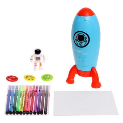 Проектор-ракета, свет, 3 слайда, 18 картинок. Проектор-ракета привлечет внимание своим необычным дизайном и надолго займет малыша благодаря множеству полезных функций. Игрушка не только развлечет ребенка — с ней можно осваивать новые навыки! <b> Особенности игрушки</b> <ul> <li> В комплекте вы найдете 12 фломастеров, 3 слайда (18 картинок) и фигурку космонавта.</li> <li> Проектор можно использовать как ночник.</li> <li> Есть кнопка включения.</li> <li> Для работы необходимы 3 батарейки типоразмера АА. Батарейки в комплект не входят.</li> </ul> <b> Как играть</b> <ul> <li> Откройте проектор и установите слайд.</li> <li> Включите устройство и настройте четкость изображения.</li> <li> Выбранная картинка будет проецироваться на бумагу или поверхность стола.</li> <li> Смотрите, обводите, раскрашивайте изображения цветными фломастерами, придумывайте интересные истории.</li> </ul>