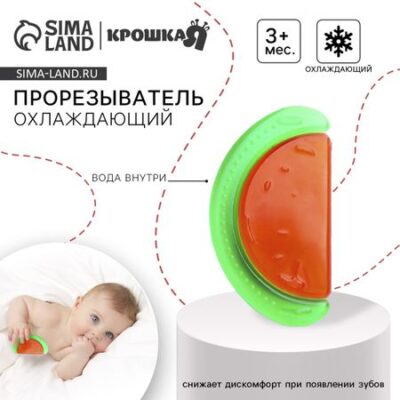 Прорезыватель охлаждающий с водой «Арбуз», от 3 мес., Крошка Я. Прорезыватель снимает неприятные ощущения в период появления первых зубов. Также изделие подготовит ребенка к процессу жевания, поспособствует формированию правильного прикуса и развитию мелкой моторики рук. Перед использованием предмет рекомендуется охладить (в воде или холодильнике). Внутри грызунка находится дистиллированная жидкость, которая сохраняет низкую температуру. Покусывая такой прорезыватель, кроха быстрее почувствует облегчение. Приспособление смягчит боль, уменьшит отек и зуд в ротовой полости. <b> Особенности:</b> <ul> <li> рельефные элементы для массажа десен;</li> <li> мягкий и эластичный материал;</li> <li> оптимальные форма и размер для детской ладони;</li> <li> охлаждающий эффект.</li> </ul> <b> Внимание!</b> Не помещайте прорезыватель в морозильную камеру. Товар изготовлен из прочного и безопасного силикона, не содержащего бисфенола А. Подходит для детей от 3 месяцев.