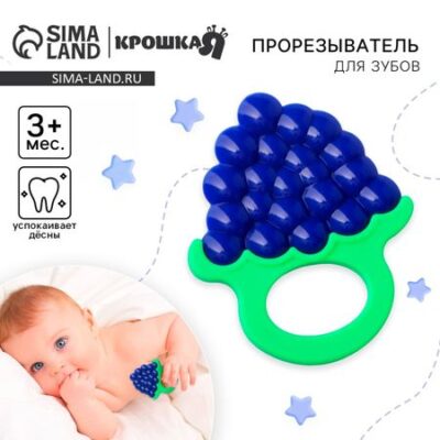 Прорезыватель силиконовый для зубов «Виноградик», от 3 мес., Крошка Я. Прорезыватель снимает неприятные ощущения у малыша в период появления первых зубов. Также изделие подготовит ребенка к процессу жевания, поспособствует формированию правильного прикуса и развитию мелкой моторики рук. <b> Особенности:</b> <ul> <li> рельефные элементы для массажа десен;</li> <li> мягкий и эластичный материал;</li> <li> оптимальные форма и размер для детской ладони.</li> </ul> Перед использованием поместите предмет на 20 минут в холодильник. Низкая температура даст анестезирующий эффект. Применение такого прорезывателя уменьшит отеки и зуд в деснах, поможет малышу быстрее успокоиться. <b> Внимание! </b> Изделие запрещено охлаждать в морозильной камере. Товар изготовлен из прочного и безопасного силикона, не содержащего бисфенола А. Рекомендовано для детей от 3 месяцев.