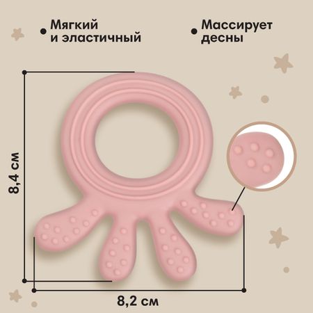 Прорезыватель силиконовый M&B «Осьминожка», от 3 мес., розовый. Прорезыватель снимает неприятные ощущения у малыша в период появления первых зубов. Также изделие подготовит ребенка к процессу жевания, поспособствует формированию правильного прикуса и развитию мелкой моторики рук. <b> Особенности:</b> <ul> <li> рельефные элементы для массажа десен;</li> <li> мягкий и эластичный материал;</li> <li> оптимальные форма и размер для детской ладони.</li> </ul> Применение такого прорезывателя уменьшит отеки и зуд в деснах, поможет малышу быстрее успокоиться. <b> Внимание!</b> Изделие запрещено охлаждать в морозильной камере. Товар изготовлен из прочного и безопасного силикона, не содержащего бисфенола А. Рекомендовано для детей от 3 месяцев.