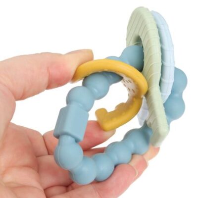 Прорезыватель силиконовый M&amp;B «Ключики», от 3 мес., синий. Прорезыватель снимает неприятные ощущения у малыша в период появления первых зубов. Также изделие подготовит ребенка к процессу жевания, поспособствует формированию правильного прикуса и развитию мелкой моторики рук. <b> Особенности:</b> <ul> <li> рельефные элементы для массажа десен;</li> <li> мягкий и эластичный материал;</li> <li> оптимальные форма и размер для детской ладони.</li> </ul> Применение такого прорезывателя уменьшит отеки и зуд в деснах, поможет малышу быстрее успокоиться. <b> Внимание!</b> Изделие запрещено охлаждать в морозильной камере. Товар изготовлен из прочного и безопасного силикона, не содержащего бисфенола А. Рекомендовано для детей от 3 месяцев.