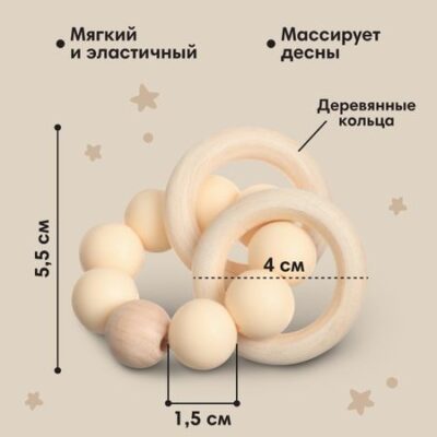 Прорезыватель силиконовый M&B с деревянным кольцом, бежевый. Прорезыватель снимает неприятные ощущения у малыша в период появления первых зубов. Также изделие подготовит ребенка к процессу жевания, поспособствует формированию правильного прикуса и развитию мелкой моторики рук. <b> Особенности:</b> <ul> <li> рельефные элементы для массажа десен;</li> <li> мягкий и эластичный материал;</li> <li> оптимальные форма и размер для детской ладони.</li> </ul> Применение такого прорезывателя уменьшит отеки и зуд в деснах, поможет малышу быстрее успокоиться. <b> Внимание!</b> Изделие запрещено охлаждать в морозильной камере. Товар изготовлен из прочного и безопасного силикона, не содержащего бисфенола А. Рекомендовано для детей от 3 месяцев.