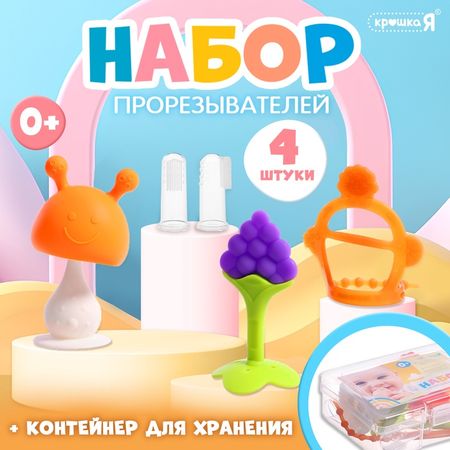 Набор из 4 прорезывателей привлечёт внимание ярким дизайном и надолго займёт малыша. Игрушка поможет облегчить боль при прорезывании зубов, а также потренировать мелкую моторику, тактильные ощущения и воображение.Как использоватьПромойте прорезыватели перед использованием в тёплой или горячей воде с мылом, затем ополосните питьевой водой.Перед тем, как дать ребёнку прорезыватель, можно поместить его на 10–15 минут в холодильник.Продезинфицируйте изделие после использования.Не используйте прорезыватель при наличии механических повреждений.Особенности прорезывателяВ наборе удобный контейнер для хранения.Изделие изготовлено из безопасного гипоаллергенного материала. Не содержит вредных красителей.Рельефная поверхность эффективно массирует дёсны и зубки.Игрушку можно кипятить и охлаждать в холодильнике.Игрушка подходит детям от 0 месяцев.