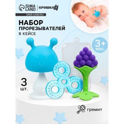 Прорезыватели силиконовые для зубов «Мой Зайка», с погремушкой, набор 3 шт., на присоске, в кейсе, Крошка Я. Прорезыватель снимает неприятные ощущения у малыша в период появления первых зубов. Также изделие подготовит ребенка к процессу жевания, поспособствует формированию правильного прикуса и развитию мелкой моторики рук. Погремушка в наборе способствует развитию воображения, познанию мира звуков, цветов и визуальному восприятию. <b> Особенности:</b> <ul> <li> рельефные элементы для массажа десен;</li> <li> мягкий и эластичный материал;</li> <li> оптимальные форма и размер для детской ладони.</li> </ul> Применение такого прорезывателя уменьшит отеки и зуд в деснах, поможет малышу быстрее успокоиться. <b> Внимание!</b> Изделие запрещено охлаждать в морозильной камере. Товар изготовлен из прочного и безопасного силикона, не содержащего бисфенола А. Рекомендовано для детей от 3 месяцев.
