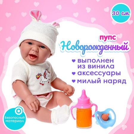 Пупс «Новорожденный» в костюмчике, с аксессуарами. Пупс — одна из самых любимых детских игрушек. Благодаря ей малыши могут освоить социальные роли, научиться заботиться о ком-либо, проявить ответственность. <b> Особенности пупса</b> <ul> <li> Высота: 30 см.</li> <li> Сделан из винила — высокоэкологичного и приятного на ощупь материала.</li> <li> Похож на настоящего малыша: на ручках и ножках есть реалистичные складочки.</li> <li> Ручки и ножки подвижные, ножки разгибаются в положении лежа.</li> <li> Одежду легко снять и подобрать другой наряд — так ваша малышка сможет проводить эксперименты с образами.</li> <li> В бутылочке жидкость налита между стенками — реалистично имитирует напиток. Бутылочка не открывается, соска в рот не вставляется.</li> </ul> <b> Польза игр с пупсом</b> Взаимодействуя с такими игрушками, девочка осваивает социальные роли, тренирует фантазию и внимательность.
