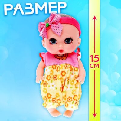 Пупс «Крошка Пупс» с аксессуарами, розовый. Пупс «Крошка» с аксессуарами — это классическая игрушка, которая учит заботе и развивает воображение. Малышка сможет купать его, переодевать и придумывать уютные истории. Рост куклы — 15 см, что удобно для маленьких ручек. <b> Особенности</b> <ul> <li> Руки и ноги пупса легко сгибаются, а ножки разводятся в положении лежа. Пластик не имеет запаха, соответствует детским стандартам безопасности.</li> <li> Розовый наряд наряд и мягкая игрушка делают набор готовым для игры. Одежду можно снимать — это учит самостоятельности.</li> <li> Куклу можно купать, что особенно важно для детей, которые любят повторять действия взрослых. Глазки не закрываются.</li> <li> Игра с пупсом помогает освоить социальные роли — малышка учится ответственности, проявляет заботу. В комплекте бутылочка для кормления.</li> </ul>