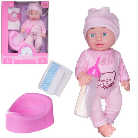 Играть с пупсом любит каждая девочка, ведь игра в «Дочки-матери» — важная и неотъемлемая часть ее детства. Симпатичная кукла-пупс из серии «Мой малыш» от бренда Abtoys выглядит как настоящий маленький ребенок. Пупс одет в розовые комбинезон и шапочку, имеет твердое пластиковое тело, подвижные руки и ноги. Если нажать на его животик, то пупсик будет издавать звуки. Кукла упакована в подарочную красивую коробку. Играя с пупсом, маленькая девочка будет развивать фантазию, воображение, коммуникативные способности, приобретать навыки заботы о близких.Высота пупса: 30 см.Комплектность: пупс – 1 шт., бутылочка для кормления – 1 шт., горшок – 1 шт., подгузник – 1 шт.Материал: полимерный материал, текстиль.Для работы требуются: 3 батарейки типа «AG13» (в комплекте).