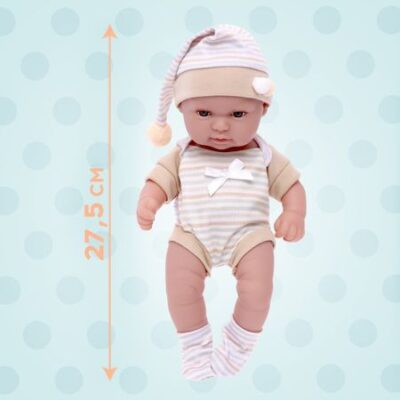 Пупс Baby of dreams, Premium edition. Пупс Baby of dreams: Premium edition — очаровательный малыш, который станет верным другом для ребенка. Мягкий виниловый материал приятен на ощупь, а компактный размер делает игрушку удобной для игр дома и на улице. <b> Особенности</b> <ul> <li> Высота 27,5 см — оптимальный размер для комфортной игры.</li> <li> Ручки и ножки подвижные, ножки разгибаются в положении лежа.</li> <li> Материал — безопасный винил, который легко моется и не имеет постороннего запаха.</li> <li> Можно купать — идеальная игрушка для водных процедур и сюжетных игр в ванной.</li> <li> Милый бежевый костюмчик создает уютный образ, который понравится ребенку.</li> </ul> <b> Играть в куклы — полезно</b> Ролевые игры с куклой помогают ребенку развивать воображение, заботливость и социальные навыки. Купание пупса станет увлекательным ритуалом, а переодевание и укладывание спать — полезным занятием для развития моторики. Пупс Baby of dreams станет отличным компаньоном в детских играх, помогая малышу лучше понимать мир и учиться проявлять заботу.