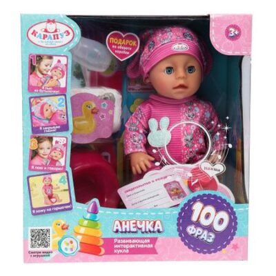 Пупс функциональный КАРАПУЗ Y30BB-BUNNY-24-RU. Интерактивный пупс «Анечка» ТМ «Карапуз» станет замечательным подарком для вашей принцессы:<br> — говорит 100 фраз<br> — поет 5 песен из м/ф (фрагменты): «Улыбка», «Облака», «Песенка друзей» из м/ф «Бременские музыканты», «Песенка Мамонтенка», «Колыбельная Медведицы»<br> — издает 8 детских звуков<br> — загадывает 5 загадок<br> — пьет из бутылочки<br> — ходит на горшок<br> — закрывает глазки<br> — подарок на обороте коробки: выдави картинки и играй!<br> <br> В комплекте:<br> — горшок<br> — бутылочка<br> — пустышка<br> — подгузник<br> <br> Милый пупс Анечка с детально проработанным личиком обязательно понравится вашей малышке. Кукла одета в милый костюмчик розовой расцветки с принтом и шапочку в тон. Одежда легко надевается и снимается. Для более интересной игры в комплекте с пупсом идут разнообразные аксессуары.<br> <br> Игра с интерактивным пупсом ТМ «Карапуз» учит ребенка заботиться об окружающих, быть ответственным и внимательным, а также развивает:<br> — воображение<br> — память<br> — звуковое восприятие и музыкальный слух<br> — социально-коммуникативные навыки<br> <br> Рост: 30 см. Материал: пластмасса + текстиль.<br> Работает от 3-х батареек типа LR44 (в комплекте).<br> Рекомендовано детям от 3-х лет.