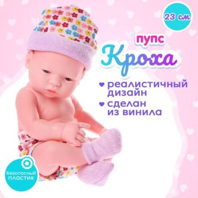 Пупс новорожденный «Кроха». Пупс — одна из самых любимых детских игрушек. Благодаря ей малыши могут освоить социальные роли, научиться заботиться о ком-либо, проявить ответственность. <b> Особенности пупса</b> <ul> <li> Высота: 23 см.</li> <li> Ручки и ножки подвижные, ножки разгибаются в положении лежа.</li> <li> Одежду легко снять и подобрать другой наряд — так ваша малышка сможет проводить эксперименты с образами.</li> <li> Сделан из винила — высокоэкологичного и приятного на ощупь материала.</li> <li> Похож на настоящего малыша: на ручках и ножках есть реалистичные складочки.</li> </ul> <b> Польза игр с пупсом</b> Взаимодействуя с такими игрушками, девочка осваивает социальные роли, тренирует фантазию и внимательность.