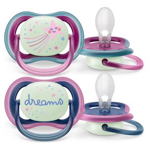Успокойте своего малыша с помощью соски-пустышки Philips Avent ultra air night SCF376/14, которая позволяет коже дышать и которую легко найти ночью. Пустышка Philips Avent ultra air night имеет большие вентиляционные отверстия, поддерживающие сухость кожи. На пустышке есть светящаяся в темноте кнопка, которая позволяет найти пустышку при выключенном свете. Максимально комфортная пустышка. Пустышки Philips Avent: мамы доверяют, малыши любят, педиатры рекомендуют¹.Позволяет коже малыша дышать. Большие отверстия для воздуха проветривают кожу малыша, обеспечивая ее сухость во время использования пустышки. Длительная подсветка в темноте. Легко находите пустышку ultra air night благодаря светящейся в темноте кнопке без необходимости включать свет. Свечение в темноте происходит за счет безопасного флуоресцентного компонента. В 98 % случаев ребенок принимает соску². Когда мы узнали у родителей, как малыши реагируют на наши бархатистые силиконовые соски, в среднем 98 % опрошенных сказали, что ребенок легко принимает пустышки Philips Avent ultra soft и ultra air.Соска на 100 % состоит из пищевого силикона. Мы специально выбрали силикон для изготовления наших пустышек, поскольку это безопасный и инертный материал, широко применяемый в медицинской сфере, который не содержит вредные химические соединения, вредные для эндокринной системы вещества (включая бисфенол-А) и аллергены. Для естественного развития зубов. Наши ортодонтические, симметричные и мягкие силиконовые соски способствуют естественному и правильному развитию полости рта. Комфорт для малыша. Наша текстурированная силиконовая соска, имитирующая форму материнской груди, помогает успокоить малыша. Один чехол для стерилизации и хранения. Дорожный чехол, поставляемый с нашими пустышками ultra soft и ultra air, выполняет функцию стерилизатора. Вам просто нужно добавить воды и положить его в микроволновую печь. Пустышка вновь будет чистой перед следующим использованием. Для максимального эффекта стерилизуйте пустышку не менее 3-х минут.Разработано и произведено в Нидерландах. Пустышки ultra soft и ultra air разработаны и произведены в Нидерландах. ¹По результатам исследования Baby Index-2022/2, MEDI-Q, проведенного весной 2022 года (март-май), компании ООО Ипсос Комкон в категориях молокоотсосов и приспособлений для кормления. ²Согласно результатам тестов с участием покупателей, проведенных в США в 2016–2017 гг., в среднем 98 % малышей принимают бархатистую соску Philips Avent, которая используется в пустышках серии ultra air и ultra soft.
