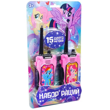 Рация детская, набор 2 шт. My Little Pony. Детские рации – связь без границ для увлекательных игр! С такими рациями дети смогут почувствовать себя настоящими шпионами, исследователями или супергероями! Они идеально подходят для активных игр на свежем воздухе, обмена сообщениями на расстоянии и веселых приключений. <strong> Особенности</strong> <ul> <li> Дальность работы до 15 метров – поддерживает четкую связь между рациями.</li> <li> Простота управления – кнопка передачи звука, динамик и микрофон для удобного общения.</li> <li> Яркий дизайн – украшены изображениями любимых персонажей.</li> <li> Легкие и компактные – удобно брать с собой в поездки и прогулки.</li> <li> Развивают воображение – способствуют ролевым играм и социальным навыкам.</li> </ul> Работают от батареек (в комплект не входят).
