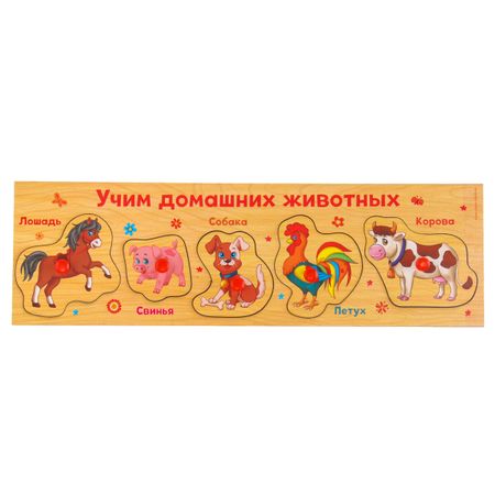 Рамка — вкладыш «Учим домашних животных», 5 элементов. Рамка-вкладыш — это деревянная доска с вырезанными фигурками, которые вынимаются из нее и вставляются обратно. Каждая деталь оснащена ручкой, благодаря которой малышу проще доставать элемент. <b> Чем полезна? </b> Вставить вкладыш в рамку — непростая задача для детской ручки. Такие упражнения развивают мелкую моторику: пальчики и кисти становятся более подвижными и гибкими. Кроме того, тренируется глазомер, логическое мышление, малыш учится устанавливать связь различных предметов между собой. Используйте милые яркие фигурки в качестве игрушек, они вдохновят кроху на новые сюжеты. В наборах вкладышей торговой марки «Лесная мастерская» собраны различные темы для расширения кругозора малыша: животные, овощи, геометрические фигуры и транспорт. Все детали сделаны из натуральной древесины, тщательно отшлифованы и покрыты безопасной краской.
