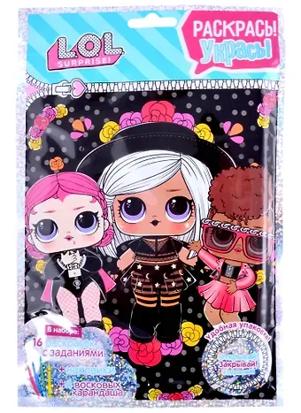 Приготовься! У Куколок L.O.L. для тебя подарок — серия ярких наборов «Укрась! Раскрась!». В каждой упаковке тебя ждут раскраски и задания с героинями из разных серий, цветные наклейки и восковые мелки. А чтобы все это не потерялось, мы придумали надежную застежку-молнию, теперь любимые героини могут путешествовать с тобой куда угодно. Раскраска с заданиями — 8 страниц, 4 восковых мелка, лист наклеек 12*17 см