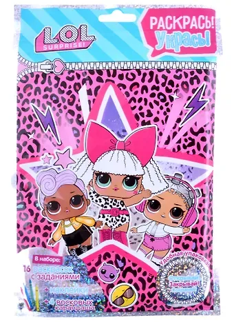 Приготовься! У Куколок L.O.L. для тебя подарок — серия ярких наборов «Укрась! Раскрась!». В каждой упаковке тебя ждут раскраски и задания с героинями из разных серий, цветные наклейки и восковые мелки. А чтобы все это не потерялось, мы придумали надежную застежку-молнию, теперь любимые героини могут путешествовать с тобой куда угодно. Раскраска с заданиями — 8 страниц, 4 восковых мелка, лист наклеек 12*17 см