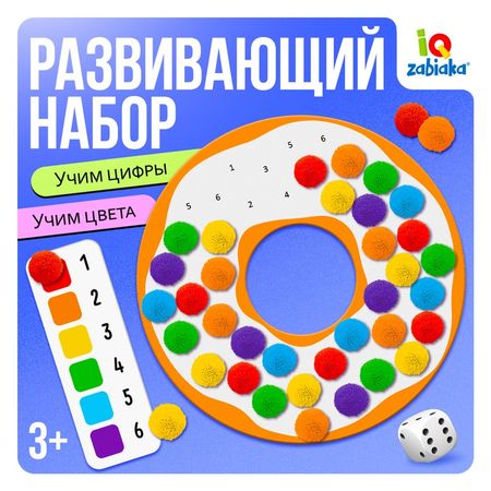 «Яркий пончик» — развивающий набор для детей от 3 лет. Увлекательный досуг поможет малышу запомнить цвета и выучить цифры в игровой форме. Яркие бомбошки привлекут внимание маленьких непосед, а познавательные карточки разовьют логическое мышление.Как игратьПоложите пончик перед малышом.Бросьте кубик и посмотрите, какой цвет означает число на нём.Попросите малыша найти цифру с кубика на пончике, а затем накрыть её бомбошкой выпавшего цвета.Увлекательно и полезноС развивающим набором «Яркий пончик» ребёнок разовьёт внимание и прокачает мелкую моторику.