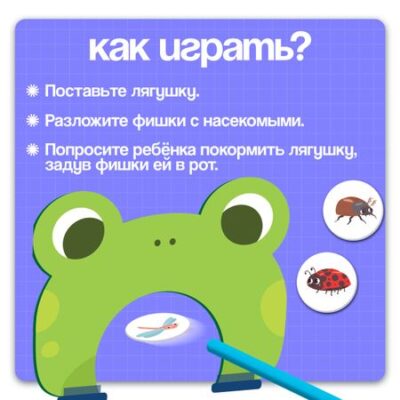 Развивающая игра для дыхания «Покорми лягушку», дыхательный тренажер, 3+. «Покорми лягушку» — развивающий набор для детей от 3 лет. С увлекательной игрой ребенок потренирует речевое дыхание и весело проведет время. Задача малыша — накормить лягушонка букашками, задув все фигурки ему в ротик. <b> Как играть</b> <ul> <li> Соберите лягушку, установив карточку на подставку.</li> <li> Разложите перед лягушкой фигурки насекомых.</li> <li> Попросите малыша задуть с помощью трубочки всех букашек в рот лягушке.</li> <li> Попросите ребенка чередовать длину выдохов. Например, стрекозу нужно задуть длинным выдохом, а жука коротким.</li> <ul> <b> Увлекательно и полезно!</b> С развивающим набором малыш в игровой форме научится регулировать силу выдоха. </ul> </ul>