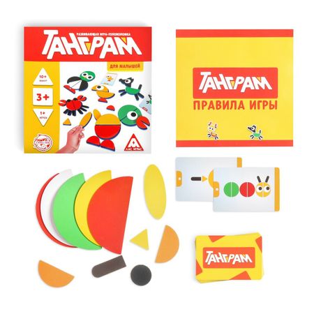 Развивающая игра-головоломка «Танграм. Для малышей», 3+. <b> Развивающая игра-головоломка для малышей</b> Малышам предстоит собирать животных, насекомых и предметы из цветных деталей. Внутри ждут задания трех уровней сложности, которые помогут развить логику, мелкую моторику и пространственное мышление! <b> Что нужно делать?</b> Разделите карточки по уровню сложности: 1 кружок — уровень 1-й (самый легкий), 2 кружка – уровень 2-й (средней сложности), 3 кружка – уровень 3-й (самый сложный). Перемешайте каждую колоду по отдельности и поместите на столе рубашкой вверх. Детали разместите на столе так, чтобы ребенок мог до них дотянуться. Попросите малыша вытянуть верхнюю карточку из колоды и поместить перед собой. Задача — составить из деталей точно такую же картинку. Если у ребенка возникают трудности, немного помогите ему, но ни в коем случае не выполняйте задание за него. Чтобы играть было интереснее, спрашивайте малыша, что изображено на карточке. Если это животное, то где оно живет, какие звуки издает и так далее. <b> Игра развивает:</b> <ul> <li> пространственное мышление;</li> <li> логику;</li> <li> моторику рук;</li> <li> внимание;</li> <li> усидчивость.</li> </ul> <b> Внутри вы найдете:</b> <ul> <li> 29 деталей;</li> <li> 21 карточку с заданиями;</li> <li> правила.</li> </ul> <b> Играйте и развивайтесь вместе с ЛАС ИГРАС!</b>