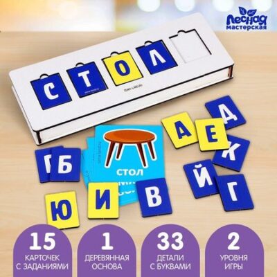 Игра «Составь слово» будет интересна и полезна как малышам, так и школьникам. В наборе идёт 15 карточек с заданиями, деревянная основа и 33 детали с буквами.Два варианта игры:Задания на голубом фоне — цель малыша посмотреть на картинку и составит слово при помощи букв.Задания на зелёном фоне — где в словах пропущена одна буква. Кроха должен понять,что это за слово, и составить его.Дошкольники и первоклассники будут с удовольствием тренировать свои знания букв.