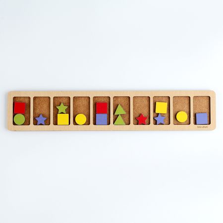 Развивающая игра — нейротренажер. Визуально-ритмический ряд. Визуально ритмический ряд – это эффективный развивающий тренажер, который может использоваться как профессиональными логопедами, так и родителями для домашних заданий с малышом. <b> Основные характеристики:</b> <ul> <li> Размер деревянной основы: 7 х 36,5 см</li> <li> 48 деталей</li> <li> 10 окошек</li> <li> Все детали выполнены из чистого и прочного материала – дерево</li> </ul> <b> Польза занятий с игрушкой:</b> Игрушка способствует развитию логического и пространственного мышления, тренирует мелкую моторику, артикуляцию, фонематический слух и чувство ритма, развивает память и внимание. Подходит для детей всех возрастных групп. <b> Как играть?</b> <b> Развиваем речь</b> Придумайте для каждого элемента слог или слово, расположите элементы в ряду и попросите ребенка озвучить весь ряд. Для усложнения задачи можно задавать ребенку разные интонации (произносить слова весело, грустно, злобно и так далее) и громкость (примеру, начать говорить шепотом в начале ряда, увеличивая громкость к концу). <b> Развиваем моторику</b> Подберите к каждому элементу определенный звук или движение (щелчок, хлопок). Составьте ряд из разных фигурок и попросите ребенка озвучить его или воспроизвести соответствующие движения. <b> Развиваем логику</b> Задайте последовательность выкладки элементов в рамках ячейки, после чего попросите ребенка ее продолжить, руководству той же логикой. Можно начать с самых простых вариантов, используя по одному элементу в ячейке, и постепенно усложняйте игру, добавляя новые формы и виды элементов.