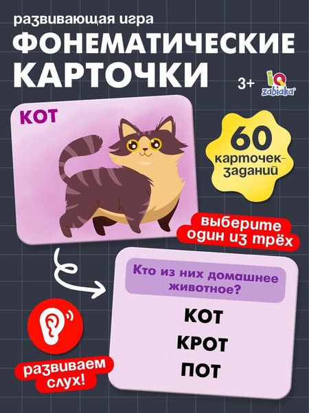 Развивающая игра «Один из трёх» — это увлекательные задания на карточках, которые помогут ребёнку развить логическое мышление, память и фонематический слух. В формате игры малыш учится слушать, анализировать и находить правильный ответ среди предложенных вариантов. Простые правила и наглядные изображения делают процесс обучения лёгким и интересным.Особенности60 карточек с вопросами и вариантами ответов.Яркие иллюстрации для визуального восприятия.Подходит детям от 3 лет.Как играть?Возьмите карточку, не показывая её ребёнку.Прочитайте вопрос и три варианта ответа вслух.Попросите малыша выбрать правильный вариант. Если ответ неверный — повторите вопрос и варианты ответа.При правильном ответе переверните карточку и покажите картинку.Прочитайте слово снова, делая акцент на ударном слоге.Развитие через игруКарточки тренируют внимание, память и умение сопоставлять информацию. Вопросы построены так, чтобы ребёнок задействовал логическое мышление и слуховое восприятие. Эта игра — простой и эффективный способ подготовки к школе.