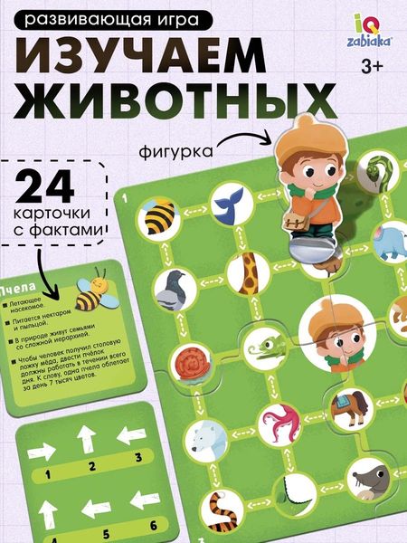 Развивающая игра «Изучаем животных» станет увлекательным занятием для малышей от 3 лет. Набор включает 24 карточки с заданиями, которые помогают ребёнку исследовать мир животных и одновременно развивать логику и внимание. Простая и понятная структура игры делает её удобной для домашних занятий и поездок.Что внутри24 карточки с заданиями и фактами о животных.Фигурка и поле для игры.Как игратьСоберите игровое поле и установите в его центре фигурку.Возьмите карточку с заданием и продиктуйте малышу направление стрелочек.Ребёнку нужно по командам провести фигурку по полю и познакомиться с одним из животных.Чем полезна играИгра стимулирует развитие таких ключевых навыков, как внимание, аналитическое мышление и концентрация. Простые задания в игровой форме мотивируют ребёнка изучать мир животных, создавая увлекательное обучение через взаимодействие с карточками. Это отличный выбор для родителей, которые ищут баланс между обучением и развлечением.
