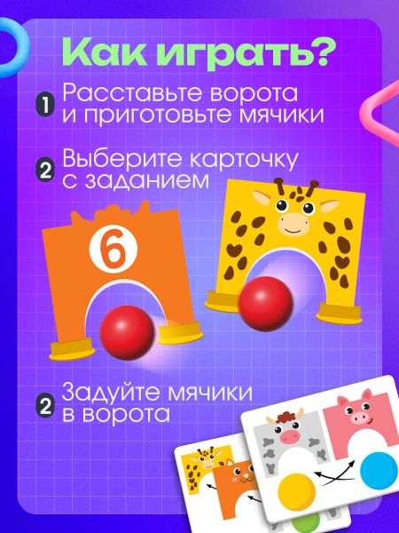 Развивающая игра — тренажер для речевого дыхания «Воздушные ворота». Учимся играя! Расставляйте ворота, выбирайте мячик и задувайте мячи разными способами! С развивающим набором «Воздушные ворота» ребенок в легкой игровой форме потренирует речевое дыхание —научится регулировать силу выдоха и правильно расходовать воздух на выдохе. <b> Зачем это нужно?</b> Когда мы учимся правильно дышать, это помогает нам говорить лучше. Мы можем произносить слова более четко, громко и правильно. Это помогает общаться друг с другом, рассказывать интересные истории и отвечать на вопросы. <b> Как использовать набор</b> <ol> <li> Соберите ворота по инструкции.</li> <li> Положите перед воротами шарик и покажите ребенку, как его можно задуть.</li> <li> Выберите карточку, попросите малыша расставить ворота и задуть мячики, как на ней показано.</li> </ol> Развивающий набор «Воздушные ворота» рекомендован для детей от 3 лет.