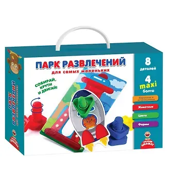 Разложите перед ребенком картонные фигуры аттракционов и зверушек. Пускай он рассмотрит их и определит кто где будет кататься. Далее с помощью болта и гайки нужно правильно соединить картонные детали. Стоит быть внимательным. Болт нужно подобрать правильной формы. Ура! Они двигаются. Теперь зверушки могут кататься на качелях!