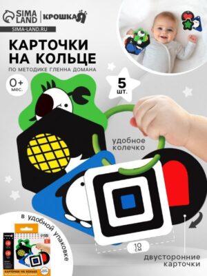 Развивающая игрушка «Цвета» карточки на кольце, по методике Г. Домана, 5 шт.. Зрение младенца развивается с первых дней жизни, и с каждым днем малыш учится фокусировать внимание на предметах и различать цвета. Преимущество метода черно-белых картинок Гленна Домана в том, что ребенок начинает развиваться одновременно физически и интелектуально. Рекомендуется начинать обучение с простых контрастных цветов — черного и белого, что способствует раннему развитию мозга и зрения. Также в периоды перевозбуждения малыша данный метод успокаивает и концентрирует его внимание на предметах и деталях