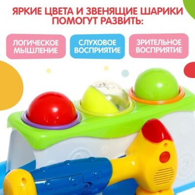 Развивающая игрушка «Веселый молоточек», звук, свет. Развивающая игрушка «Веселый молоточек» разработана специально для малышей от 12 месяцев. Она привлечет внимание трогательным дизайном и надолго займет малыша. Ребенок будет бить молоточком по шарикам и наблюдать, как они скатываются вниз по горке, издавая забавные звуки. <b> Особенности игрушки</b> <ul> <li> Игрушка выполнена из ABS-пластика. Основной характеристикой этого пластика является его высокая механическая прочность и ударостойкость.</li> <li> Молоточек при ударе о поверхность издает пищащий звук.</li> <li> Шарики издают звуки погремушки.</li> <li> Молоточек светится красным цветом. Для работы молоточка необходимы 2 батарейки типоразмера AA (не входят в комплект).</li> <li> Размер игрушки: 14,5 × 28 × 13,9 см.</li> </ul> <b> Польза занятий с развивающей игрушкой «Веселый молоточек»</b> С такой игрушкой ребенок не только весело проведет время, но и потренирует координацию движений, слуховое восприятие, мышление и воображение.