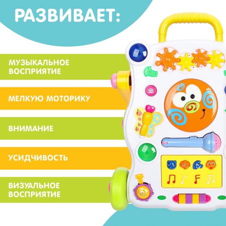 Развивающая каталка-ходунки «Первые шаги», световые и звуковые эффекты. Каталка-ходунки «Первые шаги» способствует развитию музыкального и визуального восприятия, мелкой моторики, внимания, усидчивости, координации и воображения. С веселой игрой малыш научится различать цвета и формы. Можно нажимать, двигать, крутить детали, слушать музыку и звуки. Яркая игрушка и мигающие огоньки привлекут внимание малыша. С помощью ходунков ребенок быстрее научится самостоятельно ходить.