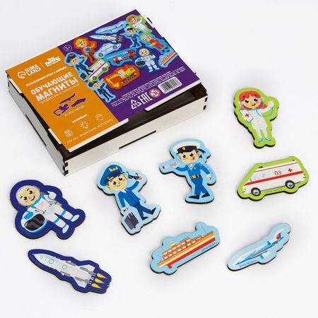 Развивающие магниты «Профессии и транспорт». Обучающие магниты украсят ваш холодильник и превратят его в поле для развития детского кругозора. <b> Как играть</b> <ol> <li> Познакомьте ребенка с профессиями, расскажите, как по одежде можно определить, какой специалист чем занимается.</li> <li> Затем предложите малышу найти транспорт для представителя каждой из них.</li> </ol> <b> Чем полезна игра</b> Занятия с магнитами расширяют кругозор, тренируют логическое мышление, усидчивость, внимательность и мелкую моторику рук.