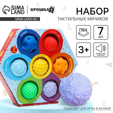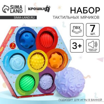 Развивающие тактильные мячики Крошка Я «Цветочек», с пищалкой, в наборе 7 шт.. Мячики с рельефной массажной поверхностью способствуют развитию мелкой моторики и тактильных ощущений. Давление на фактурную поверхность мячиков стимулирует и благоприятно воздействует на нервные окончания, ответственные за большинство процессов в организме. Шарики имеют яркие цвета, которые способствуют развитию зрения, а пищалка внутри развивает слуховое восприятие. Мячики выполнены из приятного на ощупь материала, и малышам очень удобно держать их в руках. ВАРИАНТЫ ИГР: 1. Упражнения на изучение цветов. 2. Игры на сходства и различия. 3. Упражнения на развитие мелкой моторики и тактильных способностей. 4. Игры на память. 5. Игры в воде. Мячики используются в работе преподавателями, логопедами.