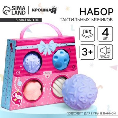 Развивающие тактильные мячики Крошка Я «Сумочка», с пищалкой, в наборе 4 шт.. Мячики с рельефной массажной поверхностью способствуют развитию мелкой моторики и тактильных ощущений. Давление на фактурную поверхность мячиков стимулирует и благоприятно воздействует на нервные окончания, ответственные за большинство процессов в организме. Шарики имеют яркие цвета, которые способствуют развитию зрения, а пищалка внутри развивает слуховое восприятие. Мячики выполнены из приятного на ощупь материала, и малышам очень удобно держать их в руках. ВАРИАНТЫ ИГР: 1. Упражнения на изучение цветов. 2. Игры на сходства и различия. 3. Упражнения на развитие мелкой моторики и тактильных способностей. 4. Игры на память. 5. Игры в воде. Мячики используются в работе преподавателями, логопедами.