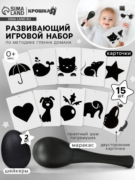Развивающий игровой набор Крошка Я, развивающие карточки и погремушки, по методике Г. Домана. Набор игрушек по методике Глена Домана поможет вашему малышу развиваться с самого раннего возраста. Преимущество метода черно-белых картинок Гленна Домана в том, что ребенок начинает развиваться одновременно физически и интелектуально. Рекомендуется начинать обучение с простых контрастных цветов — черного и белого, что способствует раннему развитию мозга и зрения. Также в периоды перевозбуждения малыша данный метод успокаивает и концентрирует его внимание на предметах и деталях А погремушки будет способствовать развитию моторики вашего малыша и познанию мира звуков.