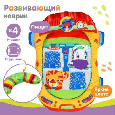 Уникальный, мягкий, развивающий коврик, с эластичным, безопасным зеркальцем, поможет занять малыша пока мама занимается домашними делами.Предлагаем вам познакомиться с играми на разные возраста:0-2 месяца:Малыш играет на спинке лёжа. На самом раннем этапе своего развития малыш тянется за яркими, притягивающими внимание игрушками и учится их хватать, так же малыш видит свое отражение в безопасном зеркальце и улыбается. В комплекте с ковриком прилагаются подвесные игрушки, яркие и привлекательные, они служат для развития тактильных ощущений и зрения.2-6 месяцев:Кроха играет, лёжа на животике. Когда малыш научится лежать на животике, игрушки можно будет снять с дуг и передвинуть их на край. Крохе будет интересно добраться до них самостоятельно, брать в ручки и изучать их.6 месяцев и старше:играем с ковриком. Когда малыш научится сидеть, дуги можно будет снять и далее использовать коврик как пространство для игр. Коврик можно выносить с собой на природу, брать на дачу и использвать как безопасное место для игр с различными игрушками.