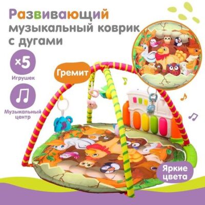 Уникальный, мягкий, развивающий коврик, поможет занять малыша пока мама занимается домашними делами.Предлагаем вам познакомиться с играми на разные возраста:0-2 месяца:Малыш играет на спинке лёжа. На самом раннем этапе своего развития малыш тянется за яркими, притягивающими внимание игрушками и учится их хватать. В комплекте с ковриком прилагаются подвесные игрушки, яркие и привлекательные, они служат для развития тактильных ощущений и зрения.2-6 месяцев:Кроха играет, лёжа на животике. Когда малыш научится лежать на животике, игрушки можно будет снять с дуг и передвинуть их на край. Крохе будет интересно добраться до них самостоятельно, брать в ручки и изучать их.6 месяцев и старше:играем с ковриком. Когда малыш научится сидеть, дуги можно будет снять и далее использовать коврик как пространство для игр. Коврик можно выносить с собой на природу, брать на дачу и использвать как безопасное место для игр с различными игрушками.