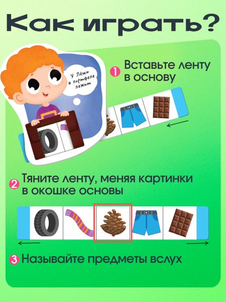 Развивающий набор «Назови звук». Развивающий набор «Назови звук» поможет малышу потренировать речь и произношение всех звуков, а также расширить словарный запас и потренировать внимательность. Внутри вы найдете 6 игровых основ, 18 пластиковых лент и памятку для родителей. <b> Как использовать набор</b> <ul> <li> Вставьте ленту в основу.</li> <li> Тяните за ленту, по очереди показывая малышу картинки.</li> <li> Называйте предметы вслух.</li> <li> Задача малыша — повторять слова за вами.</li> </ul> <b> Игры со звуком</b> <b> Поймай звук</b> <ul> <li> В начале игры ведущий называет звук, который ребенок должен поймать, если услышит в слове.</li> <li> Далее ведущий называет слова, делая акцент на заданном звуке.</li> <li> Ребенок, услышав нужный звук, должен хлопнуть в ладоши или выполнить другое заранее условленное действие.</li> </ul> <b> Общий звук</b> <ul> <li> Ведущий называет несколько слов, в которых присутствует один и тот же звук, например: нос, сани, сова, роса.</li> <li> Задача малыша — определить общий звук и назвать его.</li> </ul> <b> Найди звук</b> <ul> <li> Взрослый называет слова с недостающим звуком.</li> <li> Перед ребенком ставится задача: определить, какого звука не хватает в слове, и произнести слова полностью. Например: …пельсин, …нанас.</li> </ul> Набор рекомендован для занятий с детьми от 3 лет.