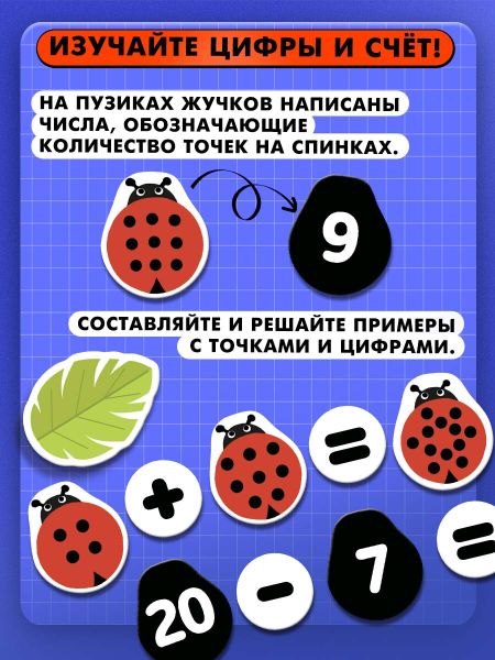 Развивающий набор «Числовые букашки». Развивающий набор «Числовые букашки» — это увлекательный способ познакомить ребенка с числами и основами математики. Красочные карточки с изображениями божьих коровок помогут запомнить цифры, научиться считать и развить логическое мышление. <b> Особенности</b> <ul> <li> 40 карточек с цифрами и божьими коровками.</li> <li> Игра в доступной форме объясняет базовые математические понятия.</li> <li> Подходит для детей от 5 лет.</li> <li> Карточки выполнены из плотного картона.</li> </ul> <b> Польза для ребенка</b> Развивающий набор «Числовые букашки» в форме игры делает процесс обучения простым и интересным. Ребенок сможет сравнивать количества, искать пары, решать примеры, тренировать память и анализировать информацию. «Числовые букашки» станет отличным помощником для родителей и педагогов, которые хотят привить детям интерес к математике с раннего возраста.