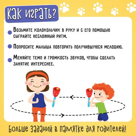 Развивающий набор «Звонкие зверушки», 3+. <em> Откройте мир музыки и ритма для малыша!</em> Музыкальный набор «Звонкие зверушки» — это увлекательный инструмент для развития воображения, логики и речевых навыков детей от 3 лет. В комплекте два колокольчика, которые станут первыми помощниками в освоении основ музыкальной логоритмики. <b> Особенности</b> <ul> <li> Набор предлагает простые и веселые задания. Родитель берет колокольчик и создает ритм, а ребенок повторяет мелодию. Меняя темп и громкость, можно превратить обучение в увлекательную игру. Такие занятия развивают слуховое восприятие и координацию движений.</li> <li> В комплект входит памятка, которая поможет взрослым организовать занятия максимально эффективно. Она содержит советы по использованию колокольчиков и идеи для разнообразия упражнений.</li> <li> Универсальный дизайн и нейтральные цвета делают набор подходящим как для мальчиков, так и для девочек.</li> </ul> «Звонкие зверушки» — идеальный выбор для родителей, которые хотят видеть малыша увлеченным, счастливым и развивающимся!