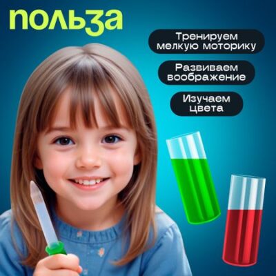 Развивающий набор «Пипетка и колбочки», 3+. «Пипетка и колбочки» — развивающий набор для детей от 3 лет. Малыш представит себя в роли химика, который проводит увлекательные опыты. Творческие и любознательные озорники будут создавать яркие картинки с помощью пипетки, колбочек и красок. <b> Как играть</b> <ul> <li> Перед игрой вместе с крохой приклейте на каждую колбу по одной наклейке с цветом.</li> <li> Расставьте перед крохой колбы и расскажите, какой цвет на ней нарисован.</li> <li> Разведите краски тех же цветов с водой.</li> <li> Попросите кроху налить цветную жидкость в соответствующую колбу.</li> <li> Фантазируйте и создавайте красочные картины!</li> </ul> Такая игра поможет развить моторику, логическое мышление и воображение.