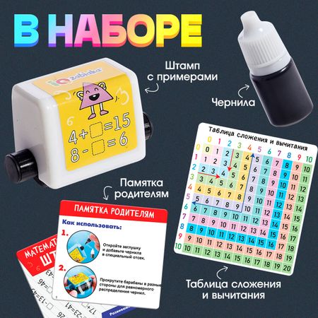 Развивающий набор «Математический штамп», 7+. Набор «Математический штамп» — это увлекательный инструмент для обучения детей сложению и вычитанию двухзначных чисел. С его помощью ребенок сможет решать примеры, развивая логику, память и внимание. Набор подходит для детей от 7 лет и станет отличным помощником в освоении основ математики. <b> Особенности набора</b> <ul> <li> В комплекте штамп для создания примеров.</li> <li> Штампы позволяют ставить столбик примеров одним нажатием.</li> <li> В набор входит таблица сложения и вычитания, а также памятка для родителей.</li> <li> Изготовлен из прочного пластика, безопасного для детей.</li> </ul> <b> Как использовать</b> <ul> <li> Откройте заглушку и добавьте чернила в специальный отсек.</li> <li> Прокрутите барабаны в разные стороны для равномерного распределения чернил.</li> </ul> <b> Польза и развитие</b> Использование штампов делает процесс обучения интерактивным и интересным. Ребенок учится считать, запоминает цифры и развивает математические навыки в игровой форме.