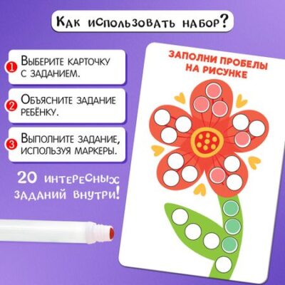 Развивающий набор «Рисуем точками», 20 заданий, 3+. Развивающий набор «Рисуем точками» создан специально для малышей от 3 лет. Выполняйте задания с помощью необыкновенных маркеров, отмечайте точками правильные ответы, дополняйте картины рисунками и выполняйте задания на внимательность. Внутри вы найдете карточки с 20 заданиями и 3 маркера. <b> Как использовать набор</b> <ul> <li> Выберите карточку с заданием.</li> <li> Объясните задание ребенку.</li> <li> Выполните задание, используя маркеры.</li> </ul> <b> Польза занятий с развивающим набором «Рисуем точками»</b> Ребенок в легкой игровой форме потренирует мелкую моторику и логическое мышление, запомнит названия основных цветов, научить считать и решать несложные задачки.