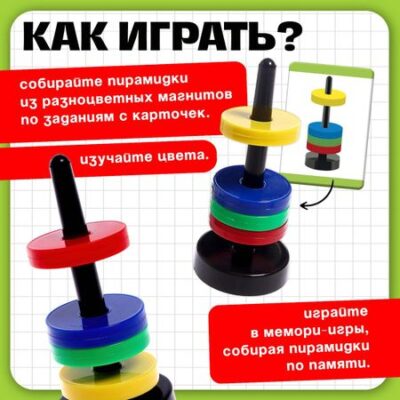 Развивающий набор «Умные магниты». Развивающий набор с магнитами непременно понравится малышу! В процессе игры кроха узнает названия цветов, потренирует логическое мышление и расширит кругозор. Попросите ребенка внимательно рассмотреть карточки и составить пирамидки из магнитных фигурок в соответствии с цветами. Расскажите про физические явления и покажите, как работает магнит. Так кроха сумеет правильно соединить кольца между собой. Если магниты притягиваются друг к другу, значит, у них разные полюса. Переверните одно из колец — и они начнут отталкиваться! Познакомьтесь с заданиями в инструкции или придумывайте свои задачки. Набор рекомендован детям старше 3 лет. Играйте и развивайтесь вместе с нами!